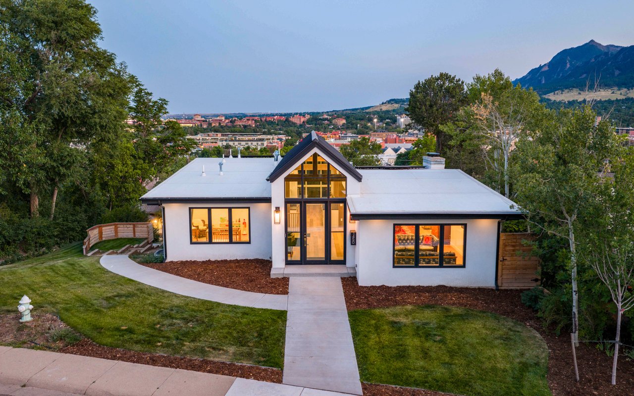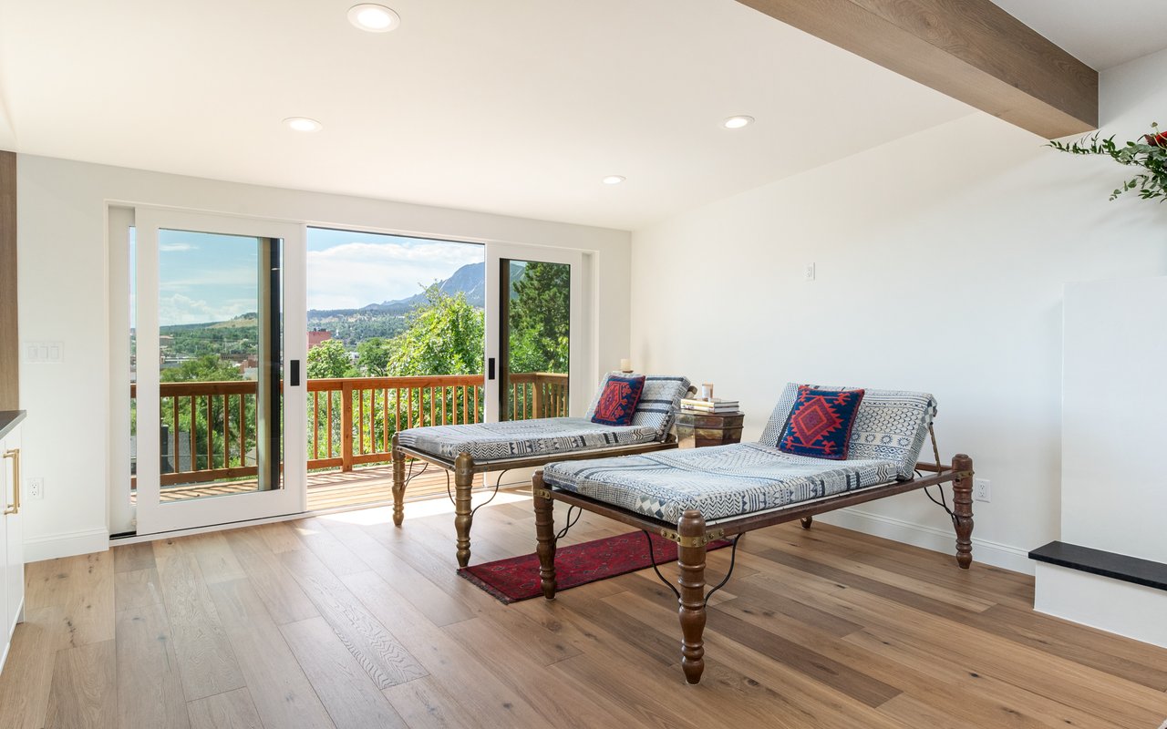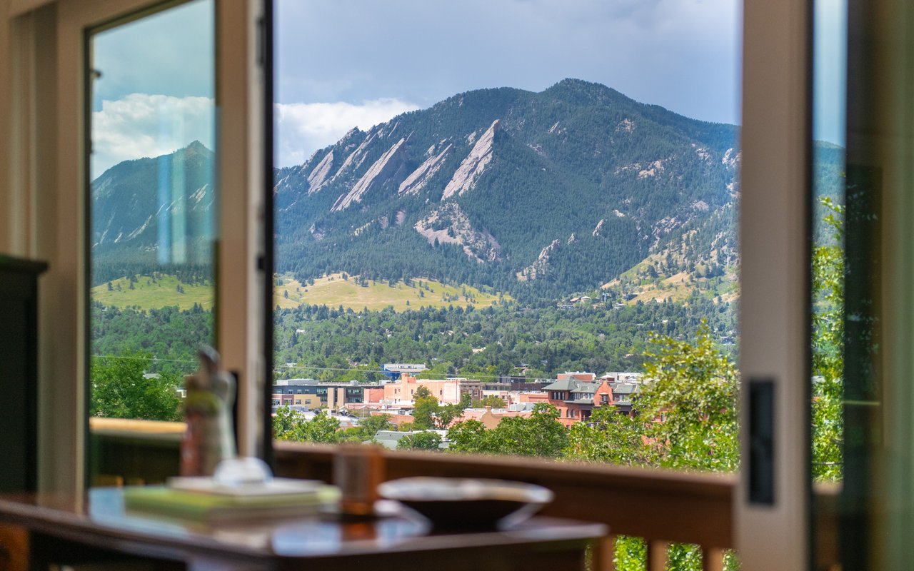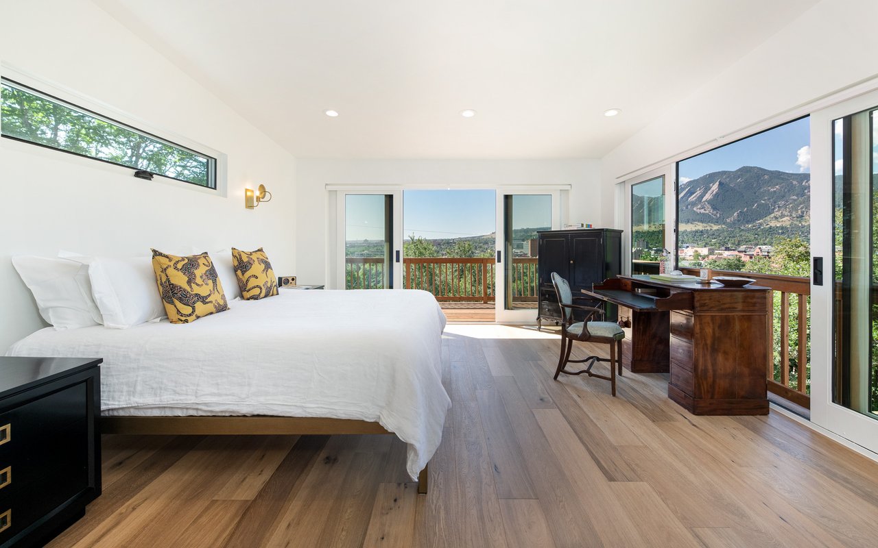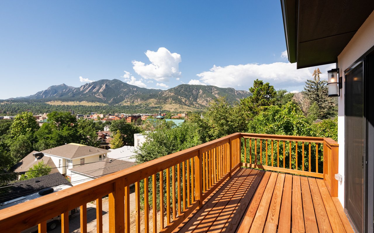 Introducing Sunset Hill's modern masterpiece, 1450 High Street, with classic Boulder elegance and unobstructed Flatiron views, completely rebuilt in 2024-25 - the pinnacle of refined living. Perched on a coveted downtown hillside, this masterfully reimagined home which includes an exquisite accessory dwelling unit (ADU) which extends the home's versatility with its separate entrance and stylish remodel is just four blocks from the iconic Pearl Street filled with Michelin restaurants, music theaters and upscale boutique shopping. A dramatic glass entry draws you in - discover chic designer interiors - an inviting open living/dining room with its exposed beams, wide-plank oak floors, wood-burning fireplace and south-facing balcony. The breathtaking, state of the art, gourmet kitchen with its expansive quartz island, marble backsplash, custom wood cabinetry, designer fixtures and luxurious Thermador appliances meets every chef's needs. The wall of new, energy efficient windows invites sunlight to cascade through the space, highlighting the exquisite craftsmanship. Enjoy coffee with Flatiron views in the breakfast nook or entertain with ease -the indoor/outdoor flow leading everyone to the deck. Escape to the main level primary suite with huge views and two sets of sliding doors to private deck & Juliet balcony. Indulge in a resort-like ensuite bath with soaking tub, thermostatic shower for two, double vanity and admire your organized oversized walk-in closet. Awake to sunrises gleaming off the foothills and the rooftops of CU. The main level includes a sweet 2nd bedroom and adjacent full bath. Downstairs, enjoy a family room with fireplace, two more bedrooms, designer bathroom, extraordinary mudroom with floor-to-ceiling cabinets and LG appliances in laundry room. The lower level sliding doors open to a patio and lush, grassy yard. Expansive parking possibilities with four private parking spaces and a garage permit in process. Living here feels like a well-kept secret.