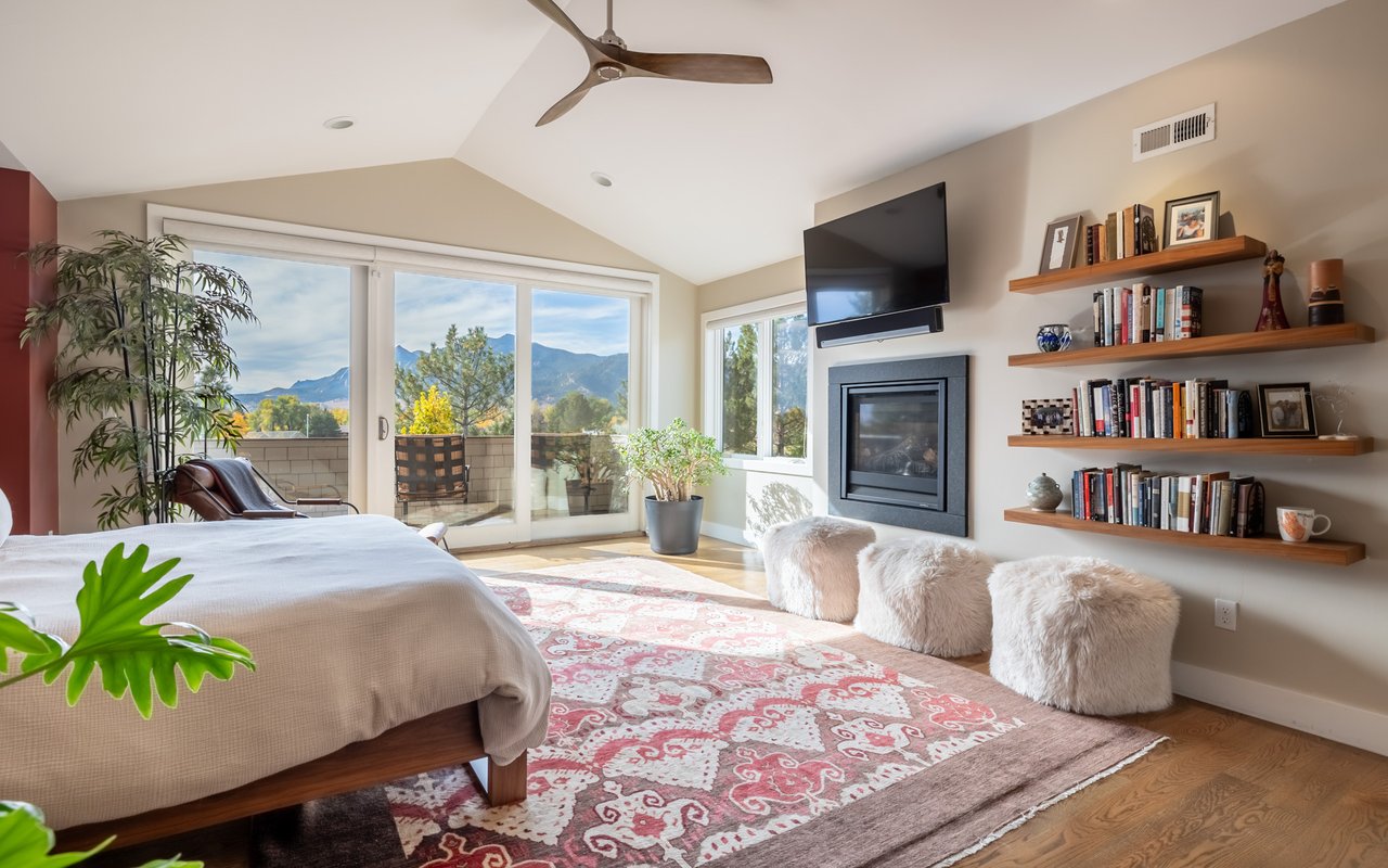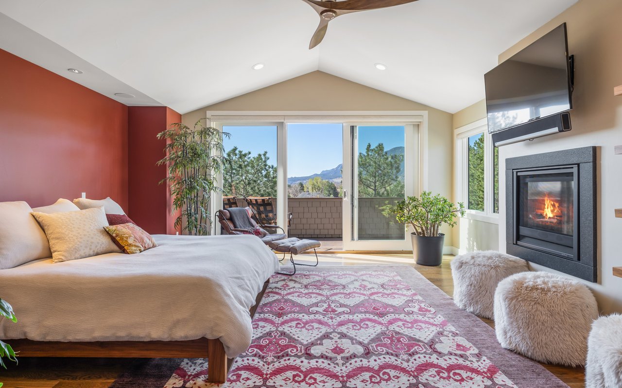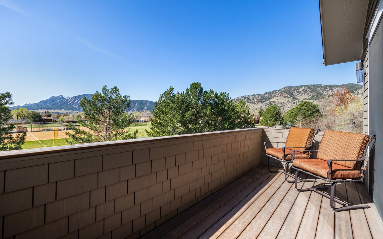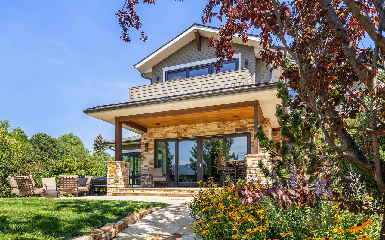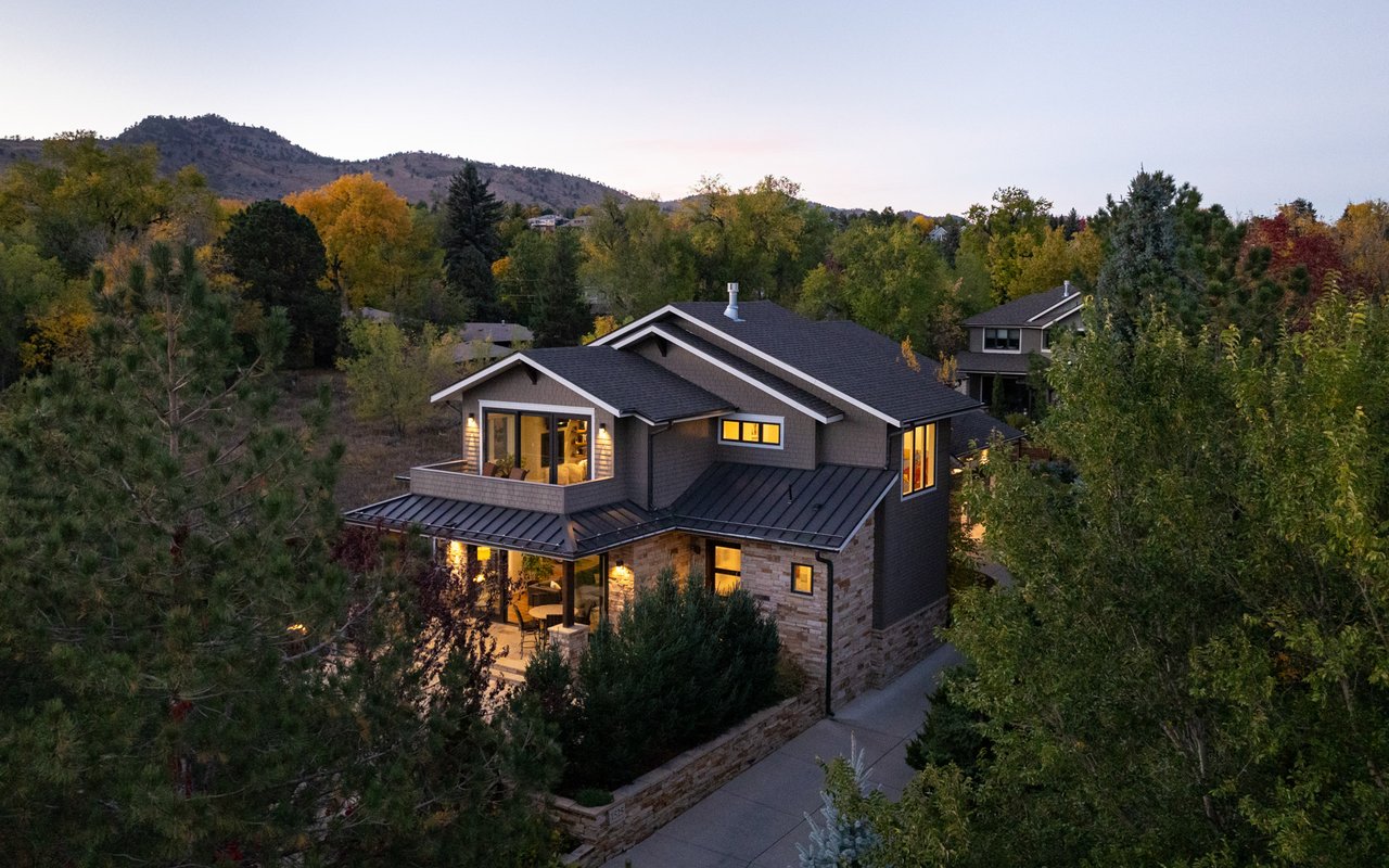 Sweeping Flatiron views meet rare tranquility and Central Boulder accessibility in this stunning 4-bedroom, 5-bath featuring an open indoor-outdoor layout and an oversized lot nestled on a tranquil Melody Heights cul-de-sac. Built in 2017, the home boasts refinished hardwood floors, fresh paint, soaring ceilings, and walls of windows framing radiant natural light. A gracious foyer with a powder room ushers you to an open great room with a gorgeous fireplace. In the gourmet open kitchen, custom cabinetry, granite counters and tile backsplashes surround top-of-the-line stainless steel appliances. The adjacent pantry adds storage space, while the center island sets the stage for casual dining. A corner office, mudroom and laundry room add exceptional convenience to the main level. Glass doors tempt you outside for world-class al fresco entertaining and lounging on covered and open patios stretching to manicured landscaping. Mature trees and fencing encircle this 0.28-acre lot for complete privacy, while breathtaking Flatirons views sweep across the horizon. In the upper-level primary suite, a king-size bedroom impresses with vaulted ceilings, a gas fireplace, a south-facing balcony, and an en suite spa bathroom with a double vanity, freestanding tub, steam shower, private water closet and massive walk-in closet. Two spacious and bright secondary suites with roomy closets and private baths complete this floor. Fun and games await on the carpeted lower level, where a huge family room and media/game area are anchored by a walk-up bar and illuminated by large egress windows. A fourth bedroom suite with a semi-private bathroom is perfect for guests or staff. A long driveway leading to an oversized three-car garage provides plenty of off-street parking, while a stone-trimmed facade adds timeless curb appeal to this turnkey Boulder beauty. This sought-after location is just minutes from Lucky's Market, Ideal Market, CU, Pearl Street, parks and trails.