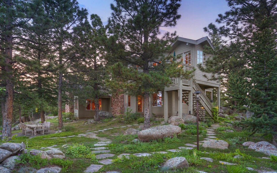 Perched atop Flagstaff Mountain on nearly 10 acres, this award winning home has panoramic views stretching from the Continental Divide, past Walker Ranch Open Space and South Boulder Peak, to the plains 3,000 ft below. Privacy is achieved by a gated and paved driveway leading to an idyllic homesite set well back from Flagstaff Rd fully embracing its surroundings. The yard is level and usable with a well curated garden, orchard, koi pond, and impressive rock outcroppings while the home. The quality construction features vaulted ceilings, exposed wooden beams and trusses, with a warm and functional layout. For privacy, the primary and junior suites are separated from the family room on the lower level. The upper level is dedicated to living, entertaining, and work spaces. Abundant windows and porches allow for easy enjoyment of the mountain setting. Additional structures include a detached two car garage with office/studio above as well as a gazebo overlooking Eldorado Canyon.
