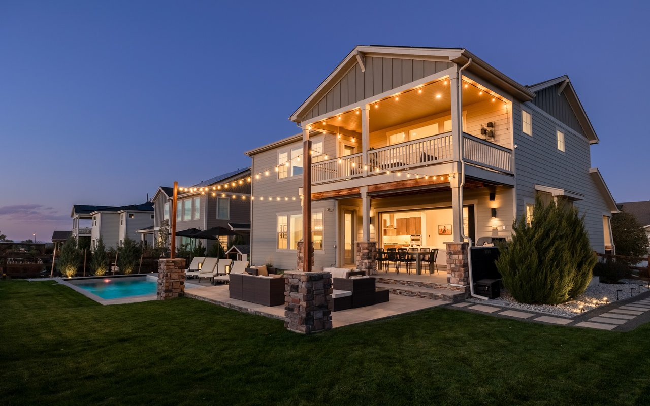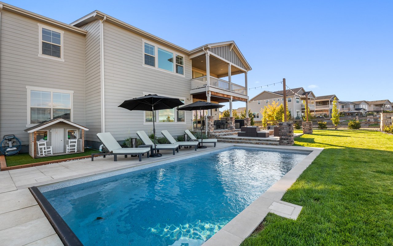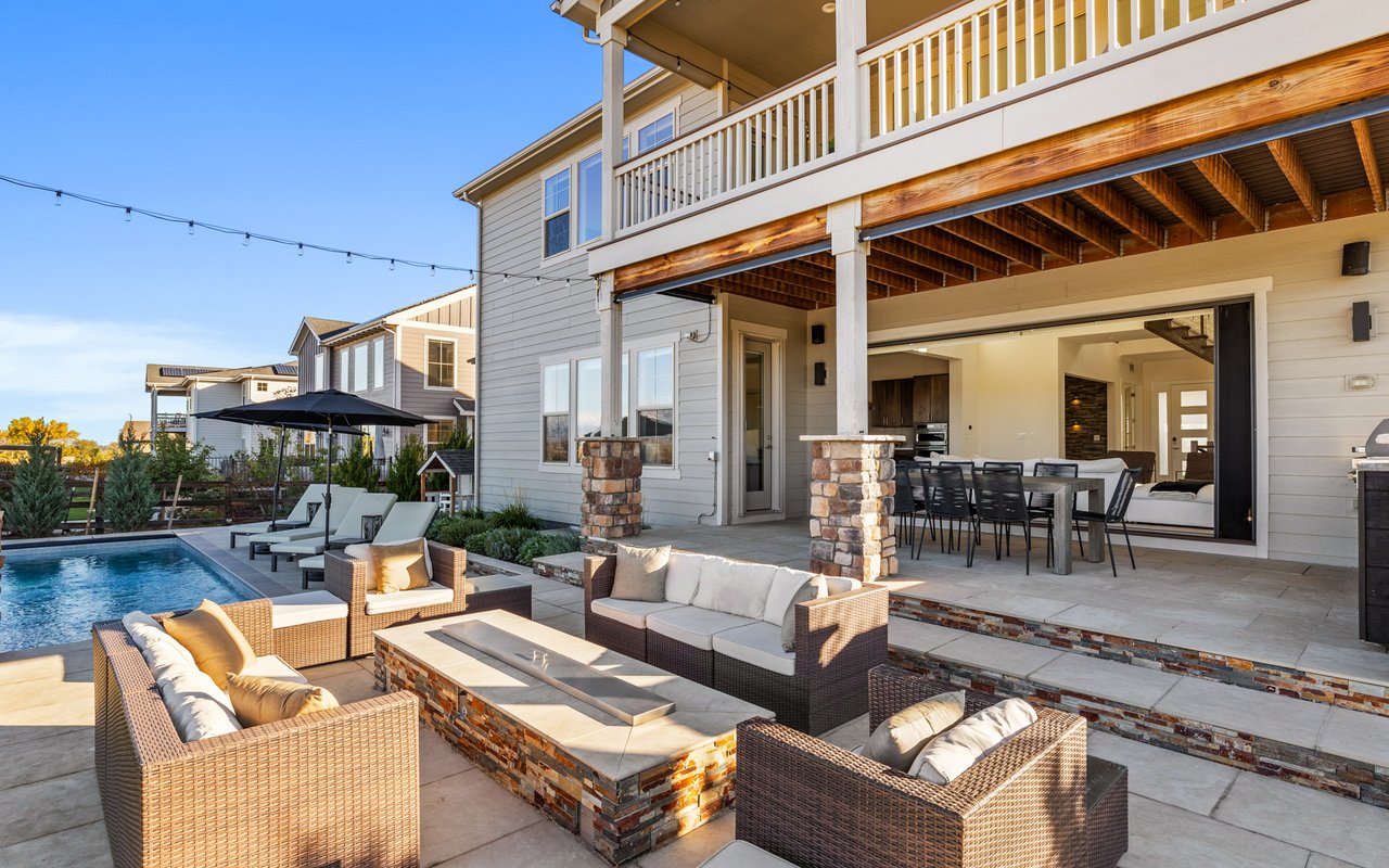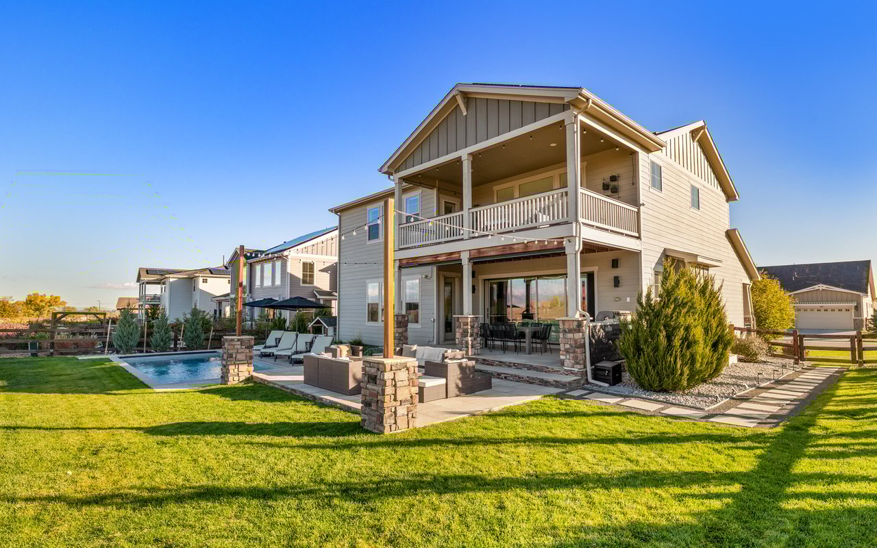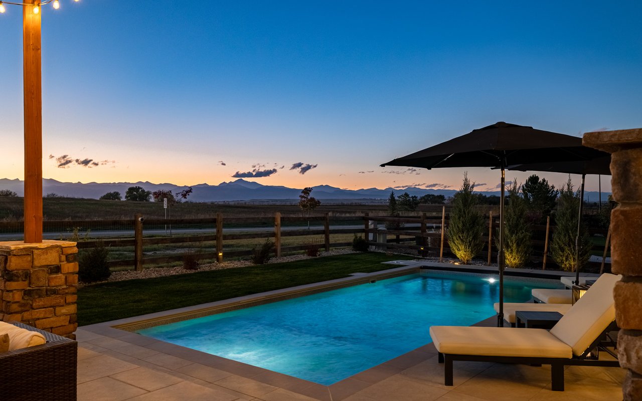 Turnkey luxury living awaits in this sun-drenched, newer-construction Erie 4-bedroom, 3.5-bath featuring expansive, upgraded interiors and poolside outdoor space. Inside this 3,954SF home, soaring ceilings and oversized windows create a bright and airy ambiance, while crisp white walls, wide-plank flooring and a soaring staircase bordered by metal-and-wire handrails underscore the contemporary aesthetic. The double-height living room features a gas fireplace, floating built-ins and double exposures. Chefs will love the gourmet open kitchen's top-of-the-line KitchenAid appliance suite, custom cabinetry, breakfast nook, and island dining counter, topped by Restoration Hardware pendants. A walk-in pantry adds storage, while a butler's pantry with a wine refrigerator leads to the formal dining room. Off the kitchen, a secondary suite is perfect for guests. A home office, powder room and mudroom complete the well-planned main level. From the living room, oversized sliders tempt you outdoors. Enjoy barbecues on the covered patio flanked by a summer kitchen, or warm yourself near the built-in gas fire pit. Ahead, the heated saltwater pool is surrounded by a sun deck, manicured landscaping and unimpeded mountain views. Head to the upper level to discover a large family room with views over the living room. The stunning primary suite boasts a king-size bedroom, private deck, two extra-large custom closets and an en suite spa bathroom. Two spacious secondary bedrooms share a Jack-and-Jill bathroom, while a large utility room with a GE washer-dryer makes laundry day a breeze. A 2,070SF unfinished lower level provides room to grow, and an oversized four-car garage adds plenty of off-street parking. Located in Flatiron Meadows, a peaceful enclave featuring foothills views, walking/biking paths, parks and easy access to Erie and Louisville amenities and BVSD schools, including nearby Meadowlark School. Discover serene country living just 20 minutes from Boulder and 40 minutes from Denver.
