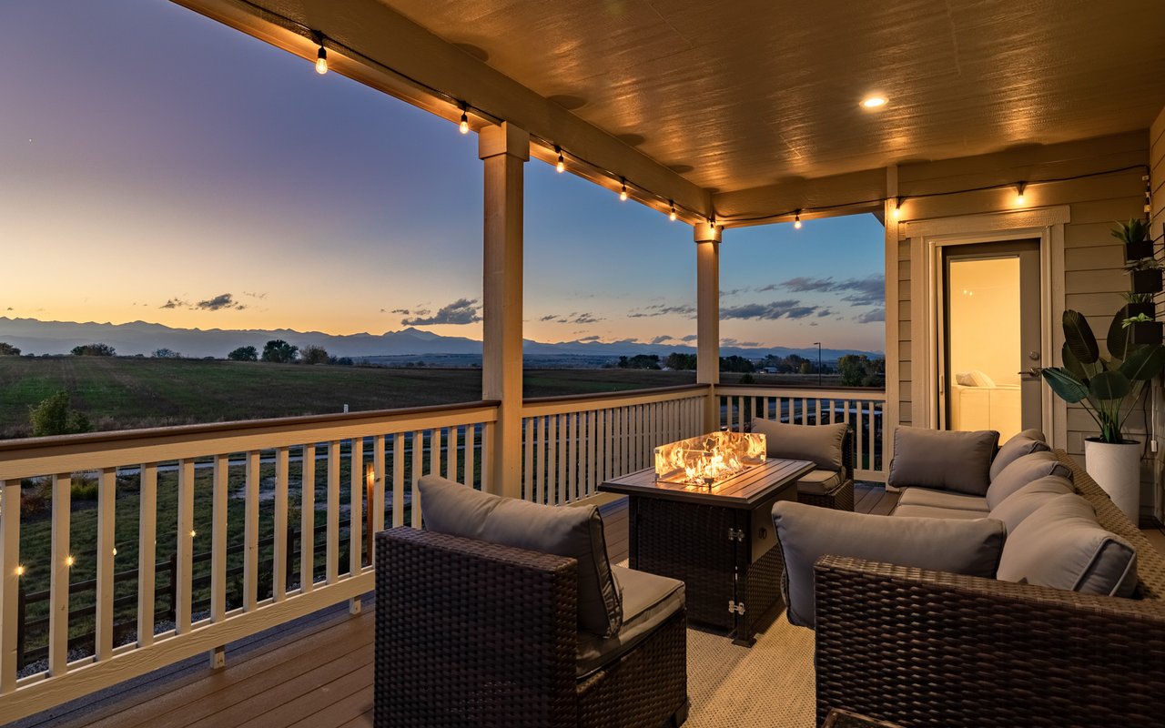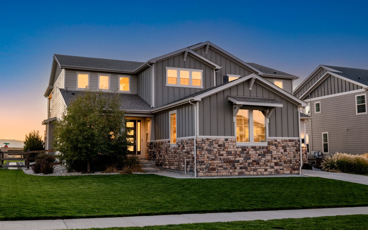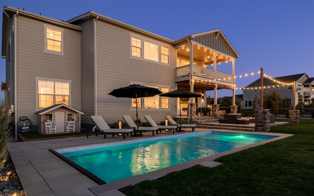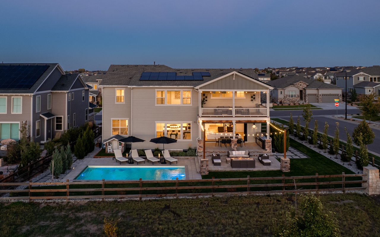 Turnkey luxury living awaits in this sun-drenched, newer-construction Erie 4-bedroom, 3.5-bath featuring expansive, upgraded interiors and poolside outdoor space. Inside this 3,954SF home, soaring ceilings and oversized windows create a bright and airy ambiance, while crisp white walls, wide-plank flooring and a soaring staircase bordered by metal-and-wire handrails underscore the contemporary aesthetic. The double-height living room features a gas fireplace, floating built-ins and double exposures. Chefs will love the gourmet open kitchen's top-of-the-line KitchenAid appliance suite, custom cabinetry, breakfast nook, and island dining counter, topped by Restoration Hardware pendants. A walk-in pantry adds storage, while a butler's pantry with a wine refrigerator leads to the formal dining room. Off the kitchen, a secondary suite is perfect for guests. A home office, powder room and mudroom complete the well-planned main level. From the living room, oversized sliders tempt you outdoors. Enjoy barbecues on the covered patio flanked by a summer kitchen, or warm yourself near the built-in gas fire pit. Ahead, the heated saltwater pool is surrounded by a sun deck, manicured landscaping and unimpeded mountain views. Head to the upper level to discover a large family room with views over the living room. The stunning primary suite boasts a king-size bedroom, private deck, two extra-large custom closets and an en suite spa bathroom. Two spacious secondary bedrooms share a Jack-and-Jill bathroom, while a large utility room with a GE washer-dryer makes laundry day a breeze. A 2,070SF unfinished lower level provides room to grow, and an oversized four-car garage adds plenty of off-street parking. Located in Flatiron Meadows, a peaceful enclave featuring foothills views, walking/biking paths, parks and easy access to Erie and Louisville amenities and BVSD schools, including nearby Meadowlark School. Discover serene country living just 20 minutes from Boulder and 40 minutes from Denver.
